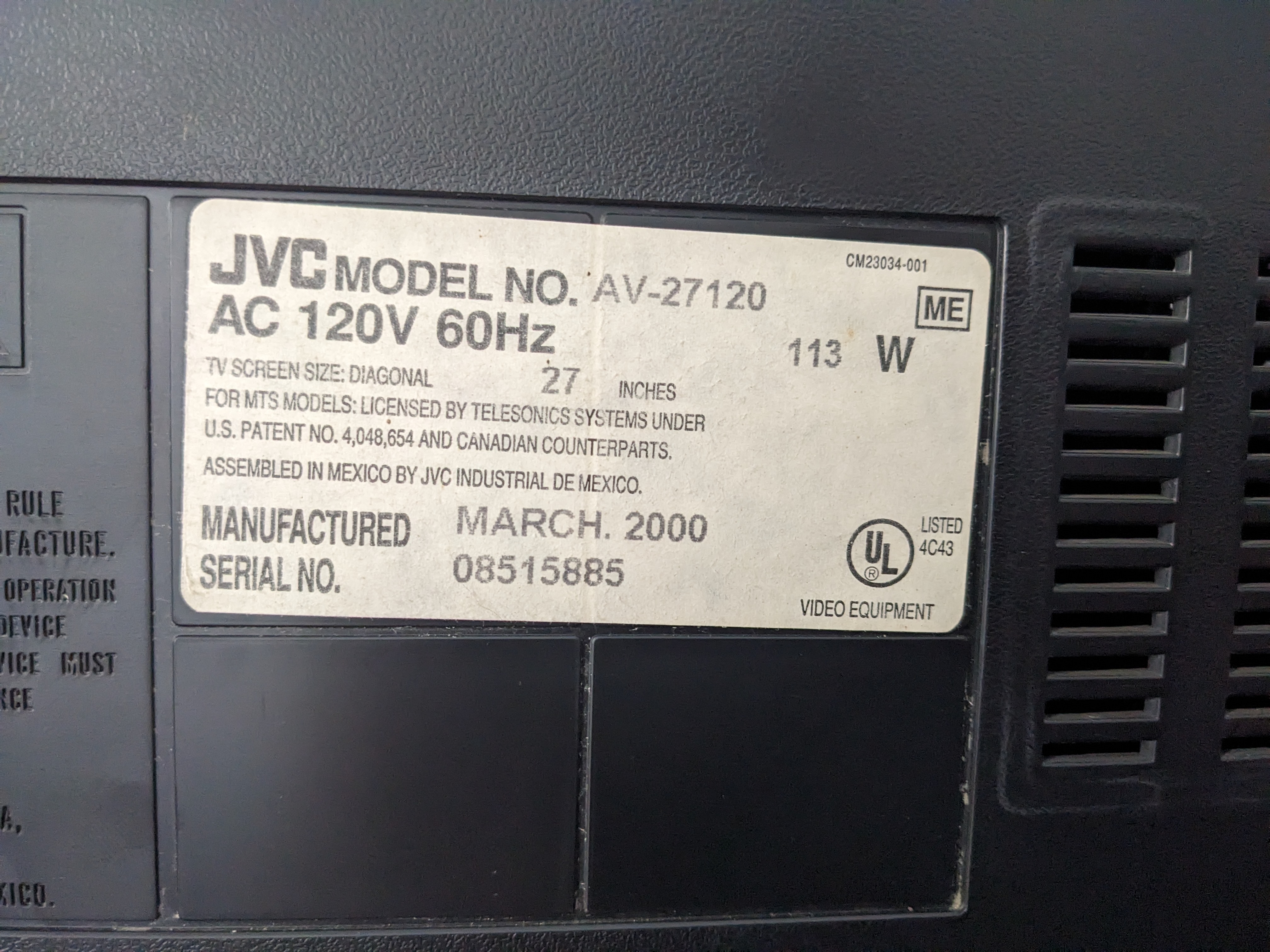 The JVC AV-27120 is a 27" consumer CRT tv released around early 2000s, featuring a curved "bubble" tube similar to the JVC D-Series. It features RF, Composite, and S-Video inputs and is a great candidate for RGB modding.