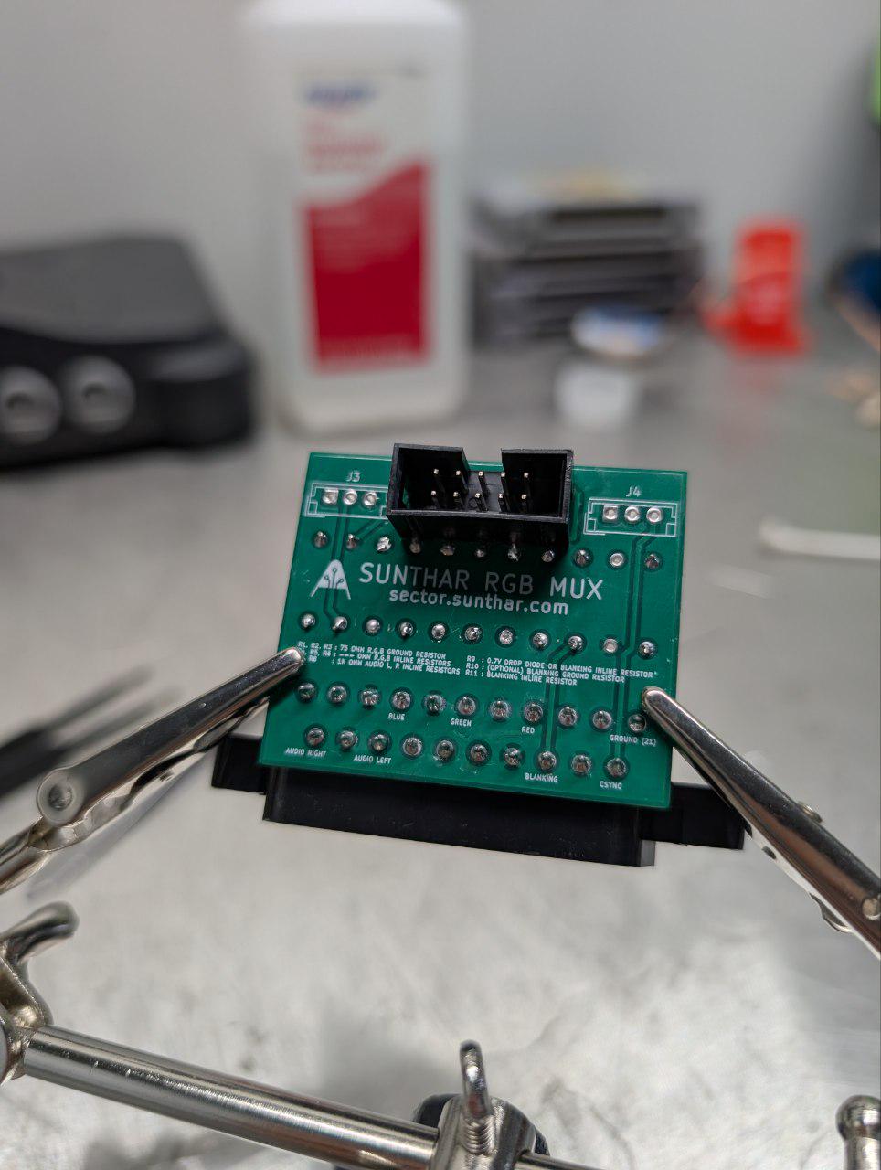 This mod uses the RGB mux board. This is optional, but will make your mod easier and stable. You can also create the circuit presented in the schematics above without the board. Please also checkout the mux calculator to play with your own values.